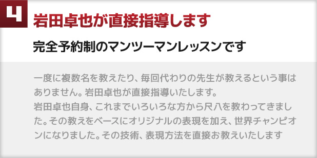 尺八は音を出すところからはじまります。うまく音が出るまで時間がかかります。ところが慣れて音が出てくる頃には尺八の魅力にどっぷりとハマってしまうくらいの楽しみを感じることができるのが魅力のひとつ。尺八演奏のテクニックだけにとらわれず、感情や雰囲気・空気感を表現する演奏のレッスンを心がけております。岩田卓也だけにしか出来ない尺八の表現をぜひとも体感し学んでいただきたいと思っております。